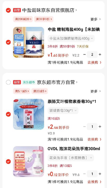 🎒 洗手液跳转APP掉落或加购物车砸金蛋砸10-5 盐两件,其他各1件,凑后洗手液0.12元