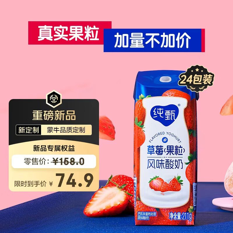 🎒 蒙牛 纯甄草莓果粒风味酸奶211g×24盒,凑99-50,200-20后,30+,需要的看看